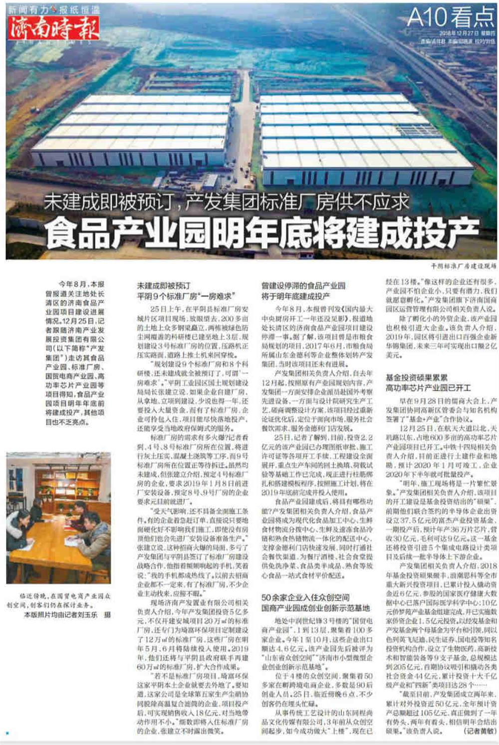 今年8月,本報(bào)曾刊發(fā)《國(guó)內(nèi)最大中央廚房開工一年還沒見影》,報(bào)道地處長(zhǎng)清區(qū)的濟(jì)南食品產(chǎn)業(yè)園項(xiàng)目建設(shè)停滯一事。12月25日,記者跟隨濟(jì)南產(chǎn)業(yè)發(fā)展投資集團(tuán)有限公司(以下簡(jiǎn)稱“產(chǎn)發(fā)集團(tuán)”)走訪其食品產(chǎn)業(yè)園、標(biāo)準(zhǔn)廠房、國(guó)貿(mào)電商產(chǎn)業(yè)園、高功率芯片產(chǎn)業(yè)園等項(xiàng)目,得知食品產(chǎn)業(yè)園項(xiàng)目明年年底前將建成投產(chǎn),其他項(xiàng)目也不乏亮點(diǎn)。